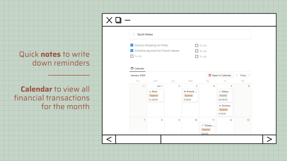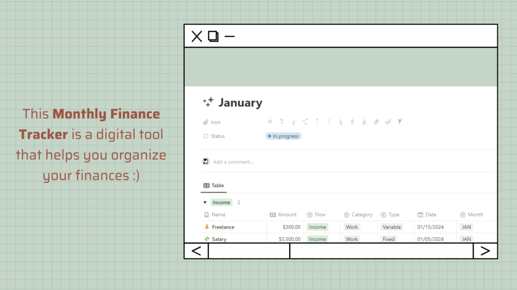 This Finance Tracker is a digital tool that helps you organize your monthly finances with table view, calendar, quick notes, filters and more :)