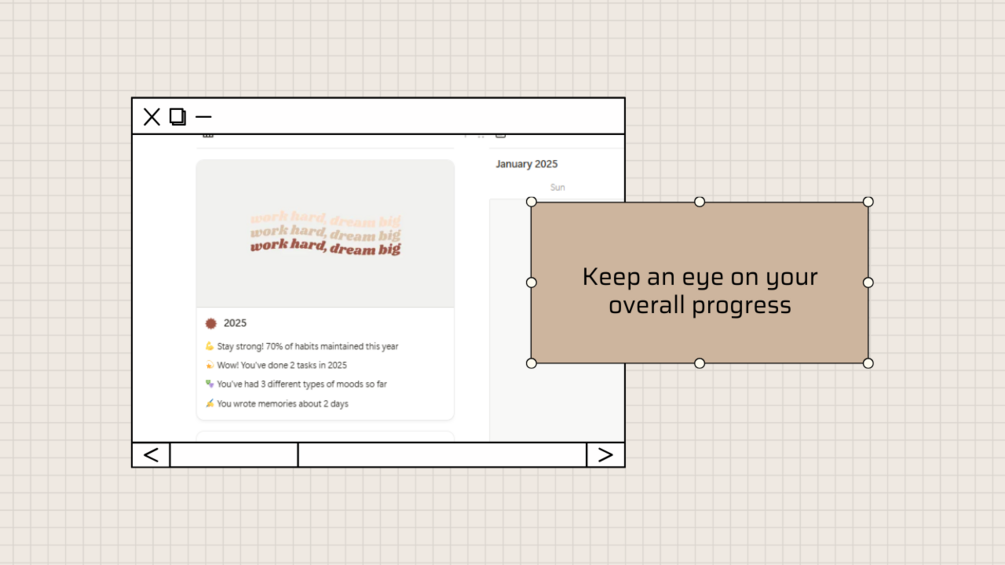 It automatically creates daily cards at your chosen time, making it simple to track your habits, tasks, and moods. You can also see everything laid out clearly on monthly cards, plus get a full year-in-review card with visual chart, space for inspiration, and goal lists to keep you motivated